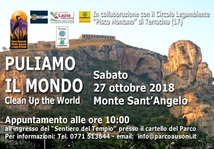 L’ente Parco regionale dei monti Ausoni e lago di Fondi aderisce ufficialmente per la quarta volta a “Puliamo il Mondo 2018” su proposta del circolo legambiente Terracina “Pisco Montano”, firmatario di un importante protocollo di intesa con il parco. la giornata ecologica di pulizia, con la partecipazione attiva degli studenti dell’IPS A. Filosi di Terracina, è aperta a tutti ed è prevista per il prossimo sabato 27 ottobre alle ore 10 presso il sentiero del tempio di Giove (o sabato 3 novembre nel caso di maltempo o pioggia).