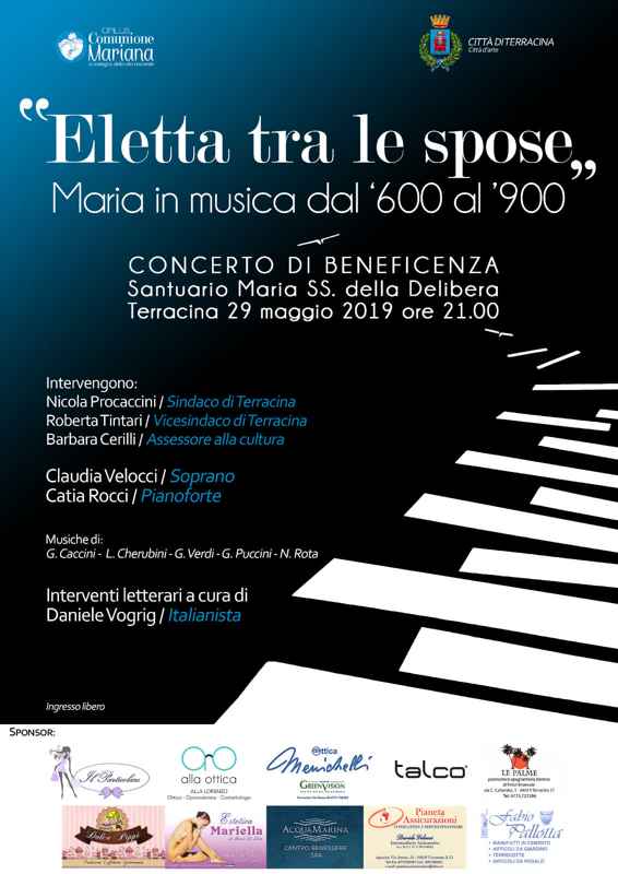 “Eletta tra le spose. Maria in musica dal '600 al '900” nasce da un'idea di Claudia Velocci, giovane soprano terracinese, con l'intento di proporre un percorso lirico tra i più celebri versi mariani messi in musica negli ultimi quattro secoli. Da Giulio Caccini a Nino Rota, passando per Verdi e Puccini, la soprano Claudia Velocci intonerà alcune tra le più belle pagine della storia della musica occidentale, accompagnata al pianoforte dalla musicista Catia Rocci.