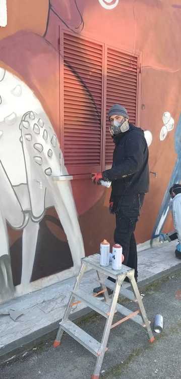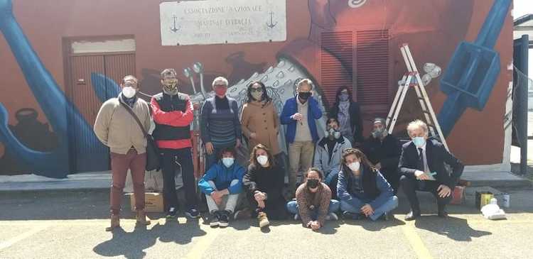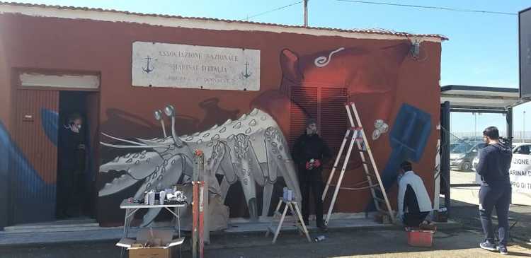 La sezione locale dell’ A.N.M.I. ha poi organizzato, come ormai consueto, grazie all’impegno e la passione di Marcello Di Lello, socio A.N.M.I, anche un importante evento di arte contemporanea, coinvolgendo la prestigiosa associazione culturale terracinese “I Colori della Vita” presieduta da Armando Sodano, artista molto conosciuto e apprezzato, la quale con il generoso supporto della Farmacia Comunale di Terracina ha coinvolto il conosciuto e apprezzato writer-graffitista Marco ROBOF coadiuvato dal writer-graffitista Umberto Simia, entrambi giovani terracinesi, per una opera di “street art” proprio nella zona del Porto, a decorazione della sede locale dell’A.N.M.I.