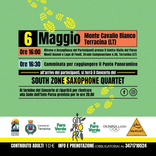 La Rassegna Camminare Verso La Musica organizzata da Ginepro Art, propone il terzo appuntamento. Sabato 6 maggio 2023 la Rassegna andrà alla scoperta di un altro sito naturalistico, questa volta nel Comune di Terracina (LT). Con partenza dal Centro Visite dell’Ente Parco Regionale Naturale Monti Ausoni e Lago di Fondi, in località Camposoriano, si prenderà il sentiero denominato “Cavallo Bianco” dall’omonimo monte. L’escursione permetterà ai partecipanti di raggiungere il punto panoramico, con ampia visuale sulla pianura Pontina, sul Monte Circeo, sul mare ed è proprio lì che si terrà il concerto del quartetto di saxofoni South Zone Saxophone Quartet composto dai musicisti Luciano Bonanni sax soprano, Danilo Florimondo Lidano sax alto, Armando Mancini sax tenore e Laura Venditti sax baritono. Il percorso di circa tre chilometri, è di medio-facile difficoltà.
