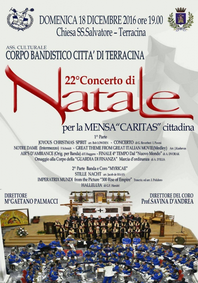 Anche quest’anno il Corpo bandistico città di Terracina sarà protagonista della solidarietà. Come succede ormai da oltre venti anni, anche questa volta l’associazione culturale presieduta dall’avvocato Orfeo Palmacci presenterà il Concerto di Natale, giunto alla sua 22esima edizione. L’appuntamento è per domenica 18 dicembre alle ore 19 nella suggestiva location della chiesa del Santissimo Salvatore. Quest’anno i fondi raccolti nel corso dello spettacolo saranno interamente destinati alla mensa “Caritas” cittadina. Con la direzione del maestro della banda, il professor Gaetano Palmacci, il corpo bandistico città di Terracina si esibirà in un concerto suddiviso in due parti. Nella prima saranno eseguiti brani della tradizione natalizia, originali per banda e colonne sonore di film. A concludere la prima parte dell’evento, un omaggio al corpo della Guardia di Finanza. Nella seconda parte del concerto, alla banda si affiancherà come di consueto il coro “Myricae” diretto dalla professoressa Savina D’Andrea. L’appuntamento è per domenica 18 dicembre alle 19 nella chiesa del Santissimo Salvatore.